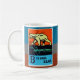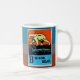 Charles Buckles Falls - B is for Bear, woodcut, 1923. A page from a 1923 ABCs book, this colorful illustration boldly depicts a bear confidently striding on all fours past a dead log, with an orange sky and blue highlights. Fun Fact: The black square in the corner is the artist's signature. Background colors of the mug extend the color theme of the illustration in muted complementary colors, but can be changed in "Edit."