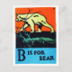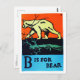 Charles Buckles Falls - B is for Bear, woodcut, 1923. A page from a 1923 ABCs book, this colorful illustration boldly depicts a bear confidently striding on all fours past a dead log, with an orange sky and blue highlights. Fun Fact: The black square in the corner is the artist's signature.