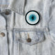 A cybernetic blue eye with various digital displays, including circles, dots, and squares, some lit up and some not, with a small crosshair in the middle and the word "vision" backwards on the bottom right.