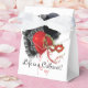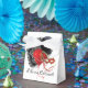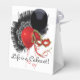 White tent-style with white ribbon favor box with a cabaret image, on the front and back, of a black feathered fan, red and black balloon, and a red mask. Optional text. We suggest changing the white ribbon to red or black satin for a more complementary look. See the entire Cancan Favor Box collection in the PARTY FAVORS section.