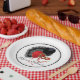 Set of eight 9” paper plates with a cabaret image of a black feathered fan, red and black balloons, and a red mask. See matching candy jar, espresso cup, mug, flask, pitcher, shot glass, teapot and coasters. See the entire Cancan Plate collection in the FOOD/BEV | Dishes section.