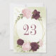 Beautiful table number card featuring cabernet purple and pink flowers and green leaves