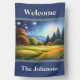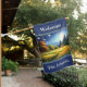 Welcome sign colorful meadow Cabin in Woods house flag. Beautiful flowers and sun in meadow with cabin. Lots of beautiful art in my stores. Add this art to other products, change to your own text.
