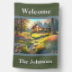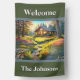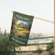 Welcome sign colorful meadow Cabin in Woods house flag. Beautiful flowers and sun in meadow with cabin. Lots of beautiful art in my stores. Add this art to other products, change to your own text.