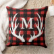 Get that rustic and warm lodge or cabin style in your man cave or any room with this amazing throw pillow. It has a black and red buffalo style plaid design with a white deer antlers design and monogram letter. Pillow is the same on both sides.