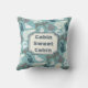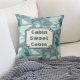 This is a great pillow for that weekend cabin! It features a delightful pattern of winter forest animals, including a bear, fox, deer, rabbit, squirrel, and bird. Some are wearing winter sweaters! The pattern is placed on a medium teal blue background. One side of the pillow has a matching dark teal lined banner, with text that says "Cabin Sweet Cabin". The text can be easily changed to anything you'd like. Cute!