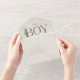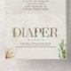 Neutral boho baby shower theme with "BOY" and "DIAPER" lettering in leather inspired faux texture decorated with boho cactus and other botanical designs. Botanical designs at corners. Background is watercolor inspired.
