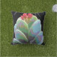 The colorful, abstract design by ZoeSPEAK on this Throw Pillow began as an original photograph of a cactus plant. The cactus leaves are smooth discs in shades of aqua blue, sage green, lavender and deep purple. The deep and light pink flower buds accent the top of the plant, and an almost black background completes this modern design.