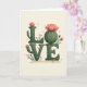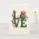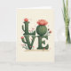 This design shows the word “LOVE” formed from desert plants, with each letter shaped like a different cactus, turning the scene into a gentle romance in the desert ❤️. The tall “L” looks like a slender, arm-like cactus topped with a coral, many-petaled flower that leans slightly as if reaching out. The “O” is a rounded, plump cactus with an even larger warm-toned bloom, like a soft center that draws the eye. The “V” repeats the upright cactus-limb look, while the “E” is built from stacked cactus segments that feel steady and supportive, like friendship standing close 🌼. Earthy greens shift from deep forest to muted olive, contrasted by coral and salmon blossoms that appear both open and budding. Small star-like floral accents dot the creamy background around the letters, and a thin sandy ground line runs beneath the word. The text sits centered, with the cactus letters in green and the flowers in warm coral-pink against the pale backdrop.