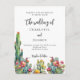 A white background decorated with colorful floral cacti. Personalize and your names and details.