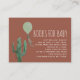 "Books for baby" book request card coordinating with "ready to pop" baby shower featuring cactus with green balloon over terracotta background with white text poem.