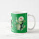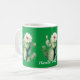This coffee mug is decorated with three beautiful cacti, cactuses on a green background with the words "handle with care" below the center cactus.
