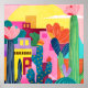 A vibrant desert scene featuring blooming cacti, colorful geometric buildings, and a glowing sunset. The bold color palette blends warm pinks, yellows, and deep blues, creating a lively Southwestern atmosphere. Perfect for adding a touch of warmth and artistic charm to any space!