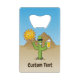 Cartoon of smiling cactus with sunglasses in desert landscape holding a beer mug and giving thumbs up. Custom text.