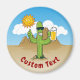 Cartoon of smiling cactus with sunglasses in desert landscape holding a beer mug and giving thumbs up. Custom text.