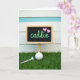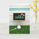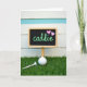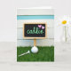 This design shows a vertical layout with a small wooden-framed chalkboard sign centered on a lightly worn white plank wall, creating a cozy, close-up scene. The word “caddie” sits in the middle of the chalkboard in bright green lettering, with two small pink hearts painted just above it 🥰. The sign feels like a sweet note left for someone special, as if it’s cheering on a favorite playing partner ❤️. Beneath the sign, a wide strip of rich emerald-green turf stretches across the bottom, adding a sporty touch to the tender mood. A white golf ball with crisp dimples rests in the grass beside a slender white tee, both angled slightly as if just set down. Behind them, a soft aqua-blue band runs horizontally across the wall, breaking up the white planks and adding depth. The green word “caddie” stands out against the dark chalkboard while the pink hearts hover near the top edge of the frame.