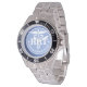 Has heft and feel of expensive stainless steel quartz watches. Good band with safety catch. I removed links, which is easy because engraved arrows show direction to push the linking pins. As always by this seller, the image (a railroad logo) is a perfect reproduction of my emailed image, and is precisely spaced and aligned.