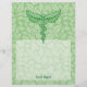 Single snake caduceus with mint leaves on light green seamless background. Custom text.