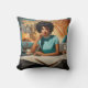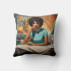The "Café Chronicle: Retro Newsreader" throw pillow captures the essence of a bygone era, featuring a Black woman deeply engrossed in the day's headlines, coffee at the ready. This scene is set in a classic diner, with vintage elements that evoke the charm of the past. The teal typewriter and matching attire of the woman add a splash of color and a dash of mid-century style to the composition. This pillow is perfect for adding a nostalgic touch to any space, offering a blend of comfort and conversation-starting design. Crafted for those who cherish the romance of reading the newspaper in a quaint café, it's a cozy addition to any home.