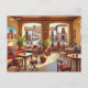 This painting captures an everyday scene at a cozy cafe in Cuzco, Peru, radiating warmth and cultural charm. Patrons sit at natural wooden tables, enjoying coffee and local delicacies in a relaxed atmosphere. Large windows frame a view of Cuzco’s historic streets, showcasing cobblestone paths and traditional terracotta-roofed buildings. Inside, the decor features vibrant textiles inspired by Peruvian patterns, potted plants, and minimalist furniture, blending traditional aesthetics with modern simplicity. The palette of warm earth tones, vibrant reds, and soft yellows is illuminated by sunlight streaming through the windows, creating a harmonious connection between the inviting interior and the rich cultural landscape outside.