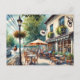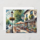 The painting captures the tranquil essence of a small, rustic cafe in Lexington, Kentucky. Wooden tables and chairs are thoughtfully arranged along a cobblestone sidewalk, inviting patrons to enjoy a peaceful coffee break. The cafe's exterior boasts vintage signage and hanging flower baskets, adding a charming and personal touch to the ambiance. A few customers sit under large umbrellas, sipping their drinks while enjoying the warm breeze. In the distance, grazing horses on lush green pastures pay homage to Lexington's equestrian identity. The color palette combines earthy tones with refreshing greens and blues, evoking a serene and welcoming atmosphere. Subtle details, like a horse mural on the cafe's side wall, enhance the connection to the city’s cultural heritage.