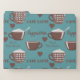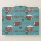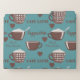 For a coffee lover, this drink is essential to start their day with good humor and energy. This beautiful design has a solid teal background on which brown coffee cups, hearts and names of different versions of this drink stand out.
