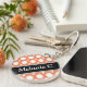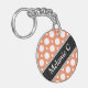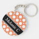 Modern 2-sided round acrylic keychain with an assorted polka dot pattern with alternating sizes of white circles over a cafe-style orange. Your name or custom text is printed diagonally in white over an off-centered diagonal black stripe on both sides.