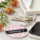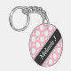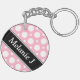 Modern 2-sided round acrylic keychain with an assorted polka dot pattern with alternating sizes of white circles over a cafe-style pink. Your name or custom text is printed diagonally in white over an off-centered diagonal black stripe on both sides.