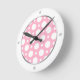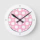 8" round wall clock designed with an assorted polka dots pattern with white circles over a cafe-style pink, and small gray circles to indicate the 3, 6, 9, and 12 o'clock hour positions. You may also upgrade to the 10.75" diameter wall clock.