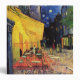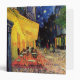 Cafe Terrace on the Place du Forum by Vincent van Gogh is a vintage fine art post impressionism architectural cityscape painting. An exterior view of a restaurant with tables, chairs, waiters, and people dining. A beautiful night with stars in the sky in Arles, France.