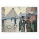 Urban life in Paris in the late 19th century. It's raining, the cobblestones are wet and shiny. People appear to hurry rather than stroll through the streets, shielded by their umbrellas. In the foreground is a fashionable middle class couple, walking arm in arm.