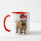 The mug has a design of a cute Cairn Terrier dog wearing a Santa hat. The background of the mug is covered in a repeating pattern of the words "woof". The image is bright and cheerful, and it would be perfect for a Christmas-themed gift.