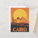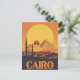 This vintage-style card showcases a striking illustration of the Cairo skyline at sunset. It beautifully combines the ancient wonders of the Pyramids and the Sphinx with the modern cityscape and its minarets. The bold, sun-drenched color palette and retro typography give it a classic, timeless feel, making it an ideal card for a traveler or a lover of history and world culture.