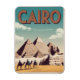 A captivating and nostalgic depiction of Cairo, Egypt, showcasing its rich history and iconic landmarks. The design captures the awe-inspiring Pyramids of Giza, the Great Sphinx, and the bustling streets of the city, framed by the Nile River. Rendered in a vintage style, the artwork evokes the timeless grandeur and vibrant atmosphere of Cairo, inviting viewers to explore its ancient wonders and dynamic urban life.