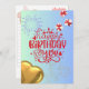 Front: The card has a light blue background. In the center, there is a large red text that reads “Happy Birthday to You,” decorated with white and red stars. Above the text, there are two white fireworks, and scattered around are small stars. To the right, there are two gift boxes with red ribbons, and in the bottom left corner, there is a golden heart-shaped balloon.