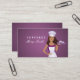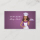 Two sided business card template for bakers with professional illustration of a fashionable baker woman wearing a chef hat holding a tray with desserts. The graphics are very elaborate. This boutique style card is modern and professional. Matching items available.