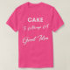 My 11 yo wore adult XL (5’7” 165#). The 8yo is small framed. She wore adult small and tied it in the back. Grandma wore adult large with long sleeve shirt underneath. Tall girl adult medium. Dark haired male adult large. Good quality dark Heather gray, Gildan brand shirt. -it was next up from basic choice and cost about $20 per shirt. Not too thick or thin. Washed and dried well, no major shrinkage. Not see-through. Can wear a bra under it fine. Screen print is just as shown and well done, front and back.