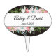 Wedding cake topper shown in a oval shape with a lovely floral print with custom sample names shown in a lovely script text in a black color.