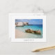 Postcard of big rocks in the water and in the sand of Cala Mariolu Beach in the Gulf of Orosei at the Emerald Coast of the island Sardinia in the Mediterranean Sea, Italy with a white border and the text: 'Sardinia'.