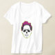 Calaca cómica con diadema de rosas, uniceja y contorno verde.