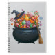 Caldron Of Giggle & Gummies notebook. A cheerful caldron beams, stuffed with candies exploding like confetti, proudly sporting a witch hat. Its broomstick buddy leans close, clearly waiting for sweet-fueled liftoff, Halloween’s happiest sugar-powered witch-mobile!