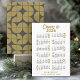 A gold and charcoal gray design - A modern look for a corporate holiday card. A calendar is included with the New Year with a greeting that can be used for any business. Add your logo and simple text to this unique design with a mid century modern half moon pattern on the back. If you need to move anything around, click on the customize button to make changes.