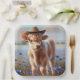 A whimsical young calf with curly fur stands in a field full of blue cornflowers wearing a cowboy hat.