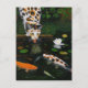 A beautiful tricolor, calico cat is drinking from a pond and looking at a koi fish with the same colors.