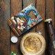 Calico cat playing with a red Chinese dragon in front of a peacock stained glass window.
