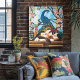 Calico cat playing with a red Chinese dragon in front of a peacock stained glass window.