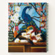 Calico cat playing with a red Chinese dragon in front of a peacock stained glass window.