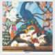 Calico cat playing with a red Chinese dragon in front of a peacock stained glass window.