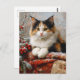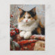 Postcard art featuring a painting of beautiful calico cat in a winter scene surrounded by red berries, pine sprigs and cozy fabrics.