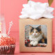 Square sticker art featuring a painting of beautiful calico cat in a winter scene surrounded by red berries, pine sprigs and cozy fabrics.